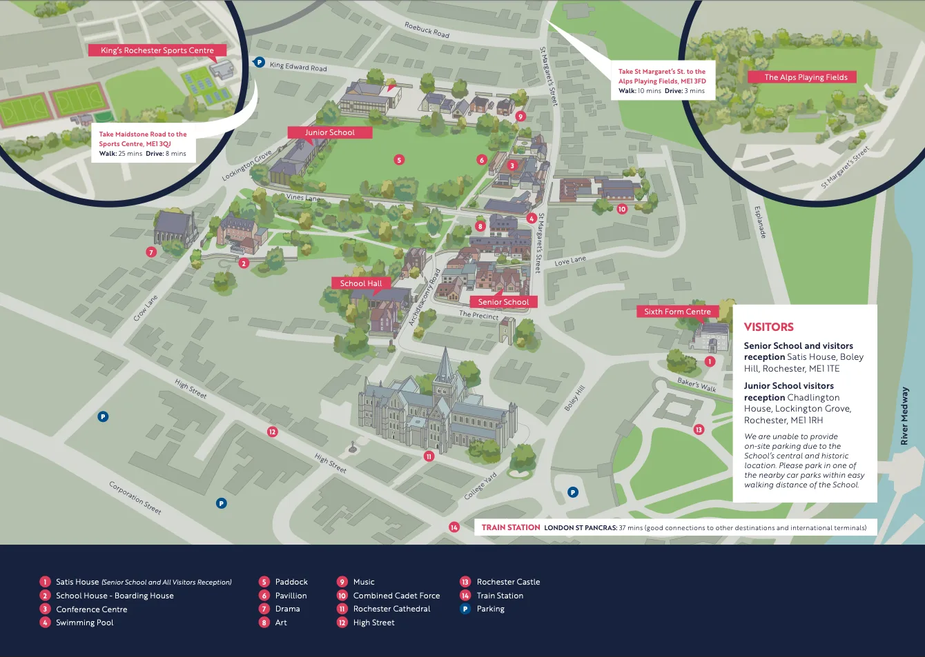 There are two maps below. The first one is an illustration of our entire site and shows you where to arrive as a visitor. The one at the bottom gives you a virtual tour. Simply move your mouse around the screen and click on each building to learn more about different areas of the School. The speech bubbles bring up specific information and the map markers will take you inside the building.