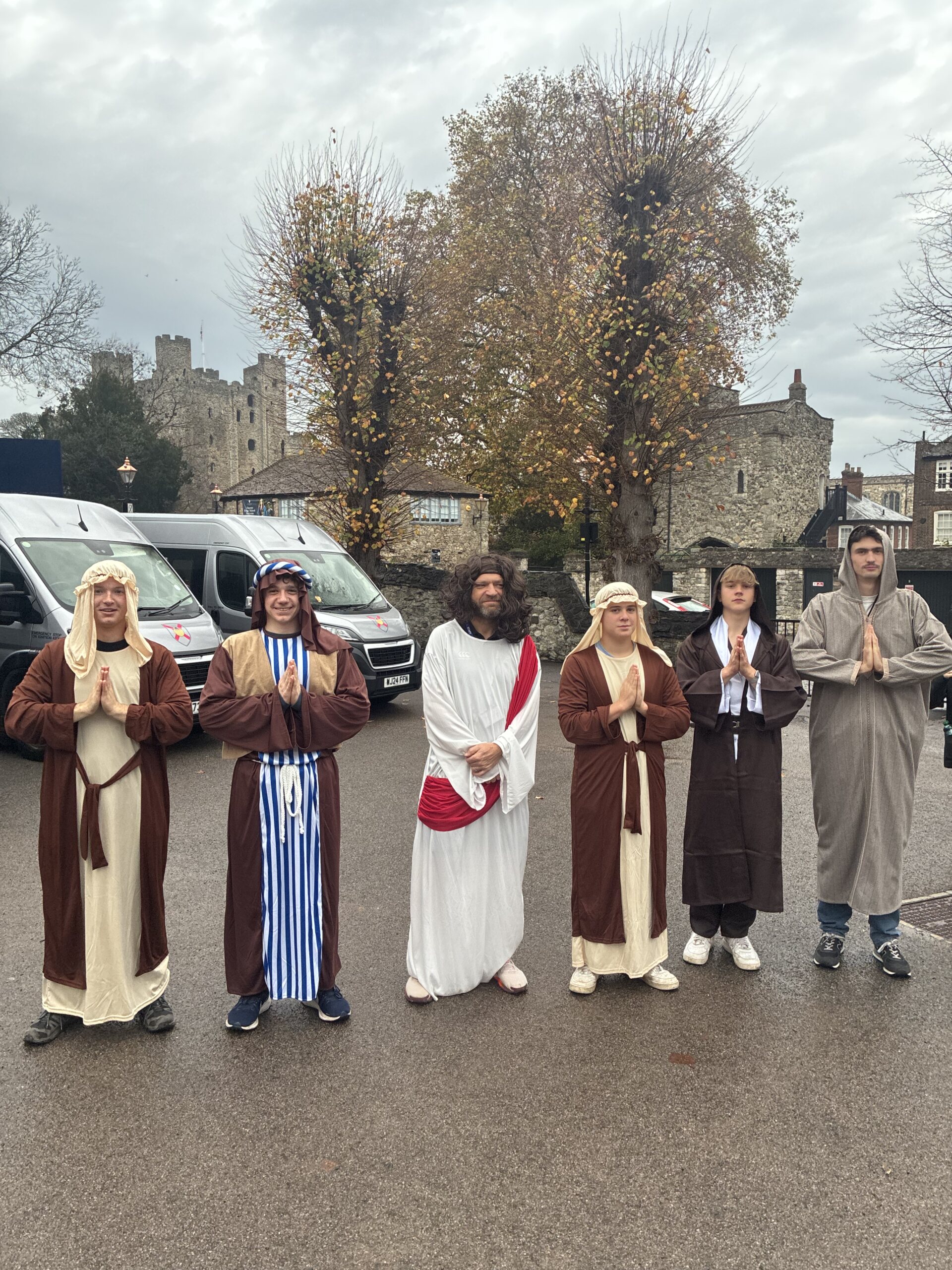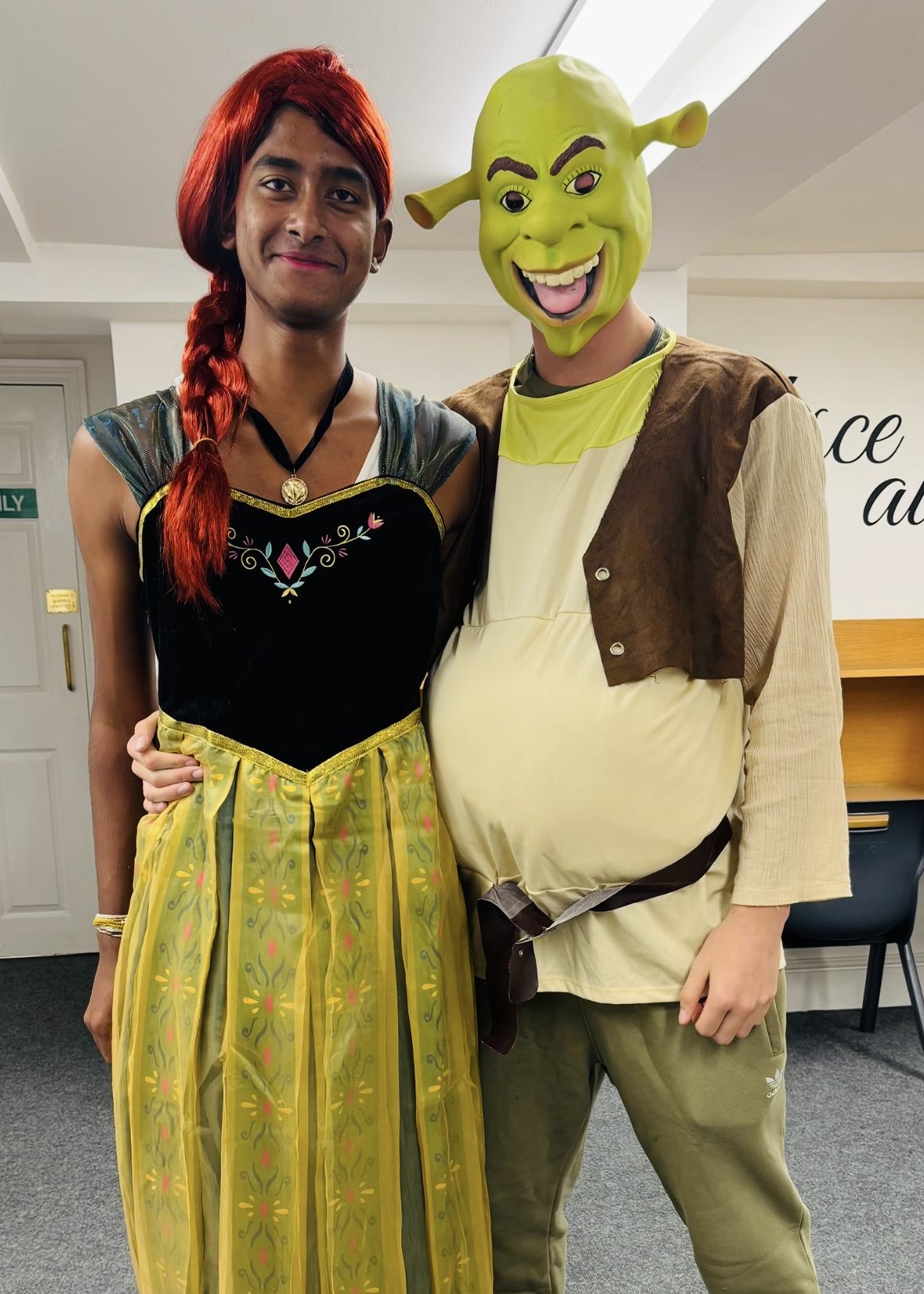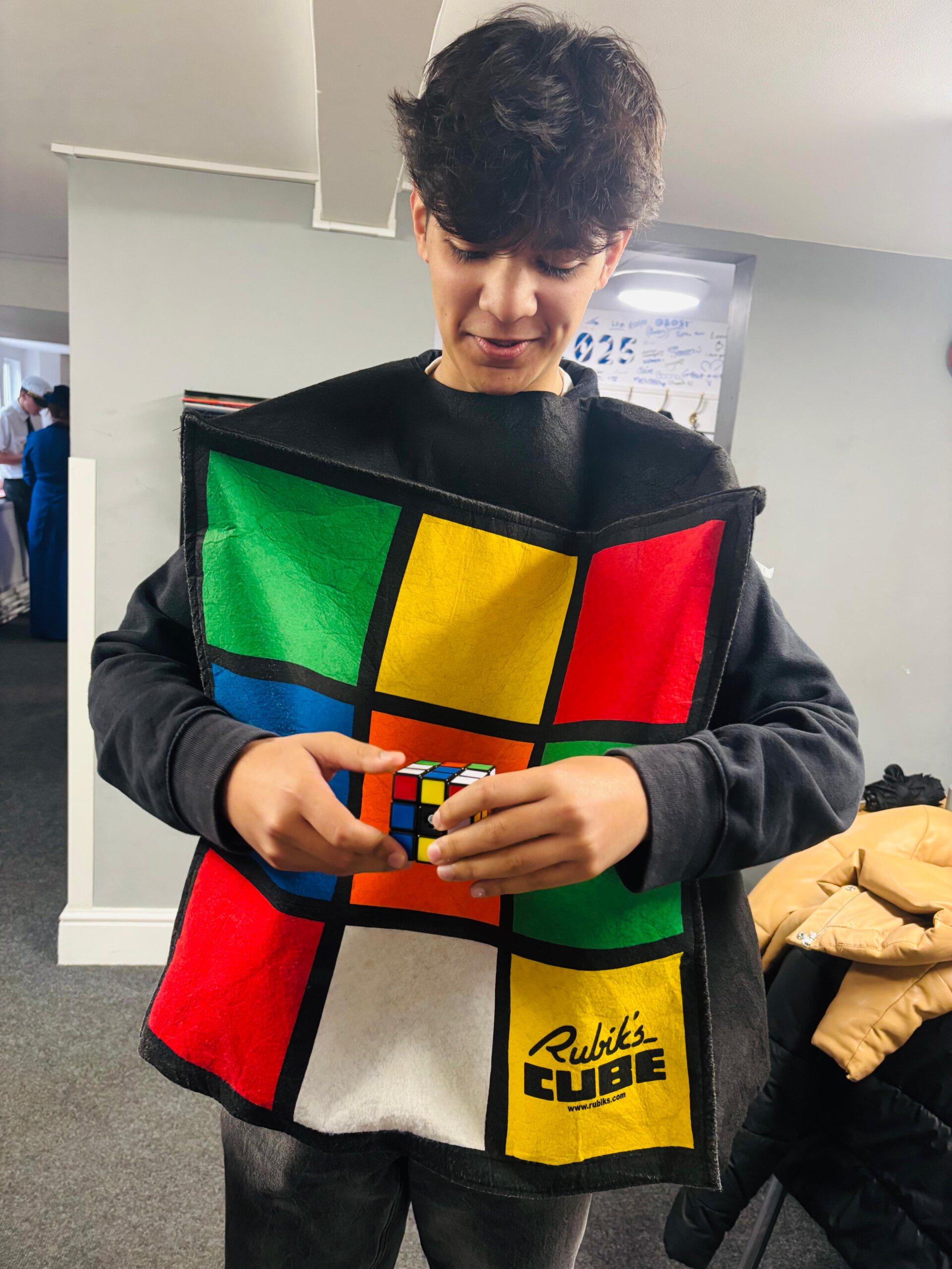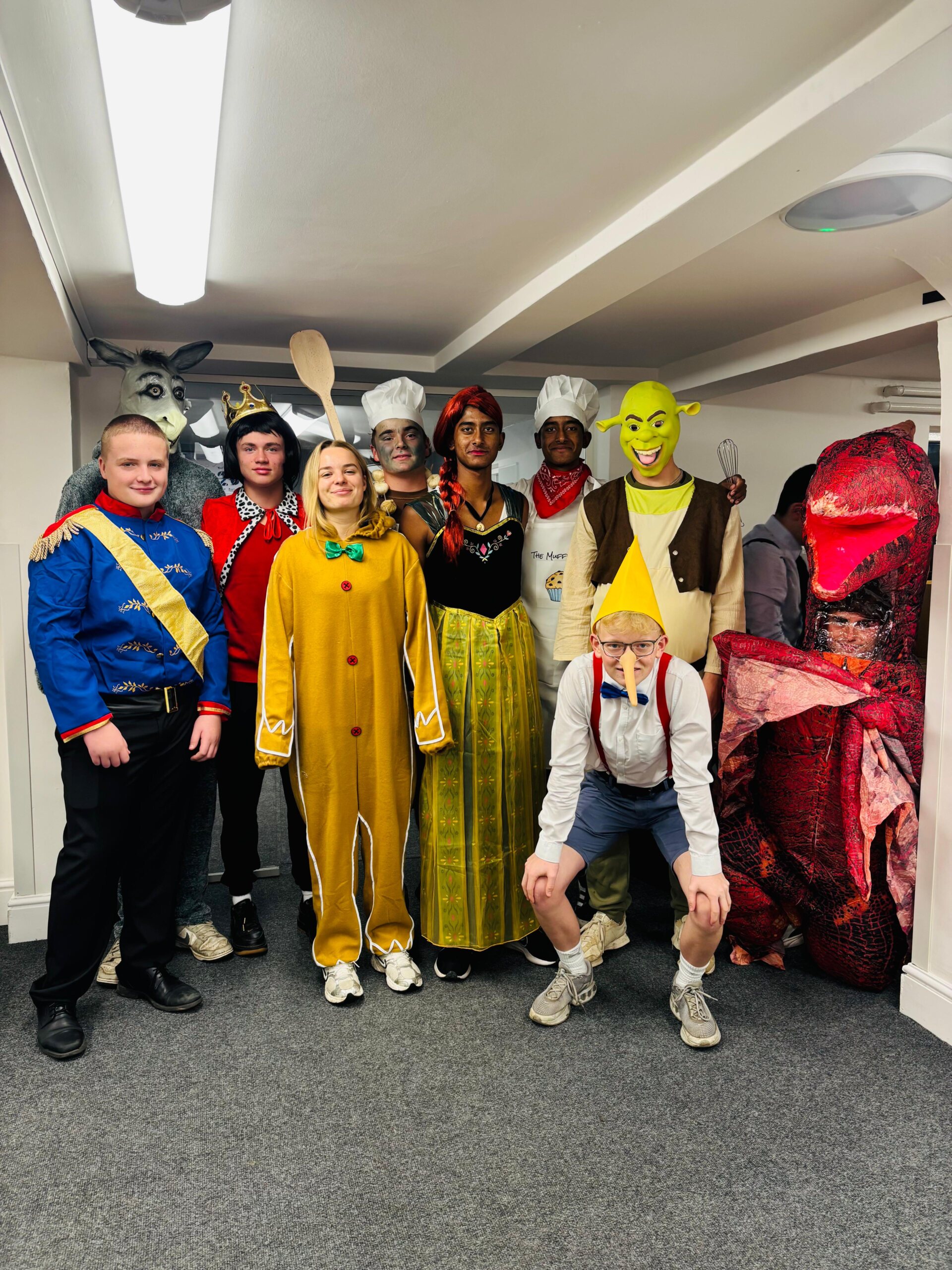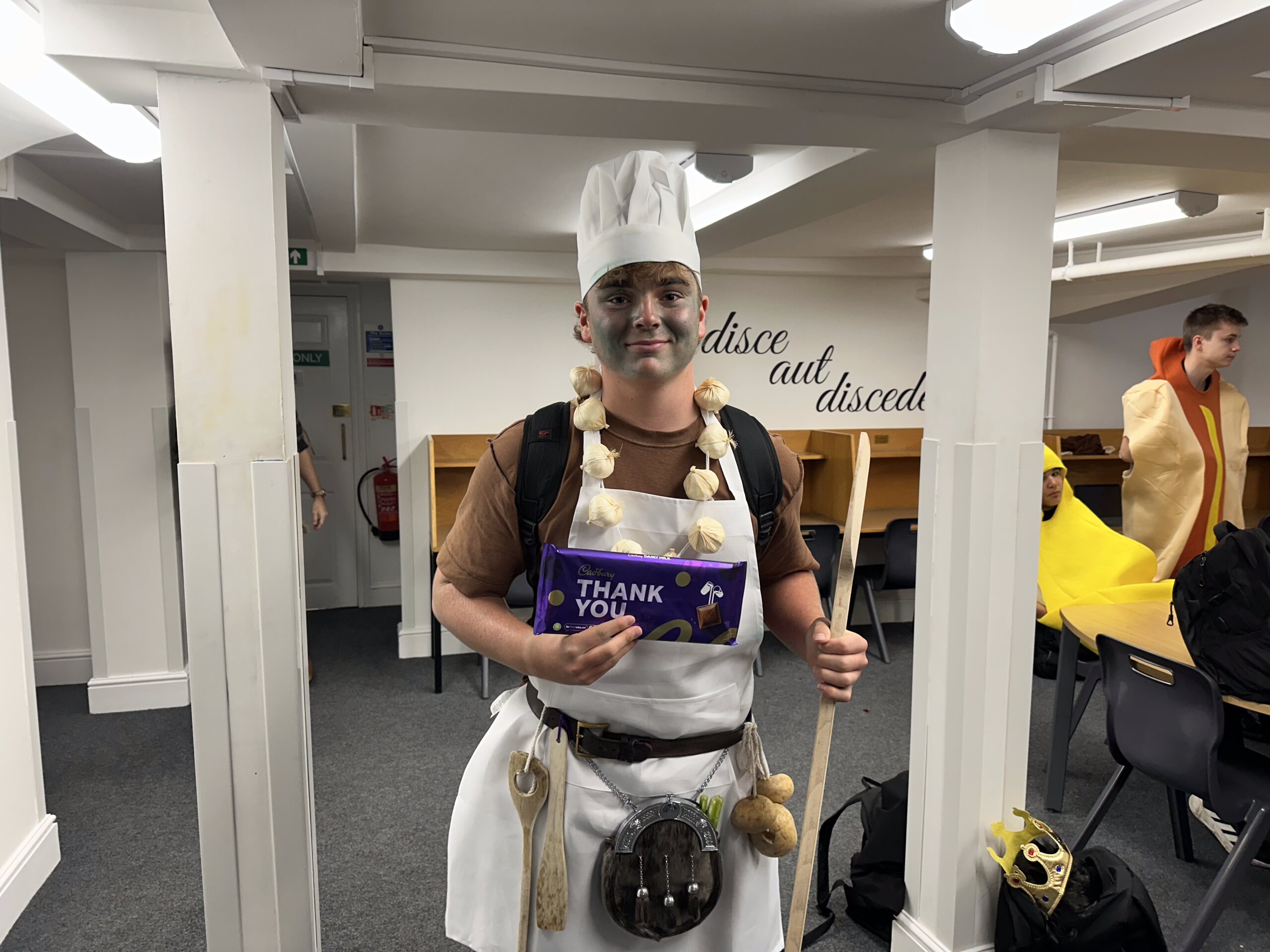 The annual Children in Need fancy dress day saw the Sixth Former Centre full of weird and wonderful characters with both staff and pupils participating. Dominating the scene was a magnificent giant pterodactyl with the pupil valiantly battling to manoeuvre through school corridors and the cobbles of Rochester. A spirited contingent of cowboys and cowgirls brought the Wild West to the school halls while the cast of Shrek were looking Shrek-tacular. Perhaps the most unexpected sight was a solemn group of disciples, whose traditional robes and serious expressions were immediately undermined by the sheer absurdity of posing for pictures next to a Rubik’s Cube, a banana, a sailor and Benson Boone. Well done to all our Sixth Formers for their gallant efforts in supporting Children in Need and congratulations to Oscar H, dressed as the chef from Shrek, who Mr Fisher picked as the winner!