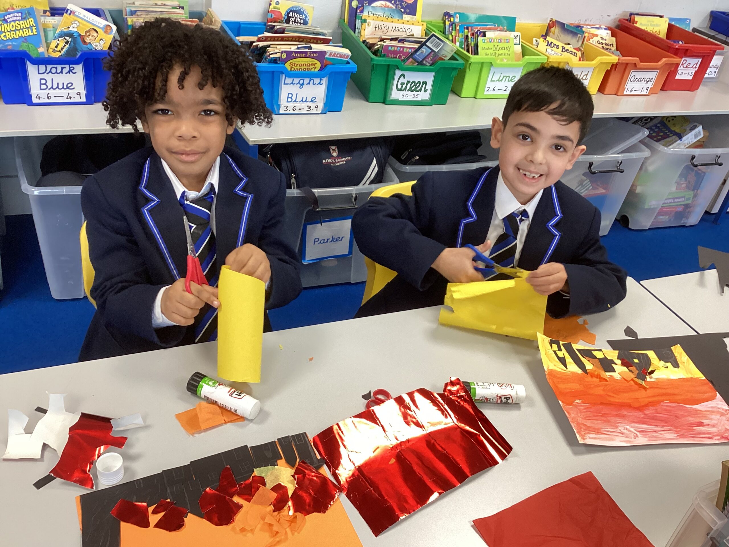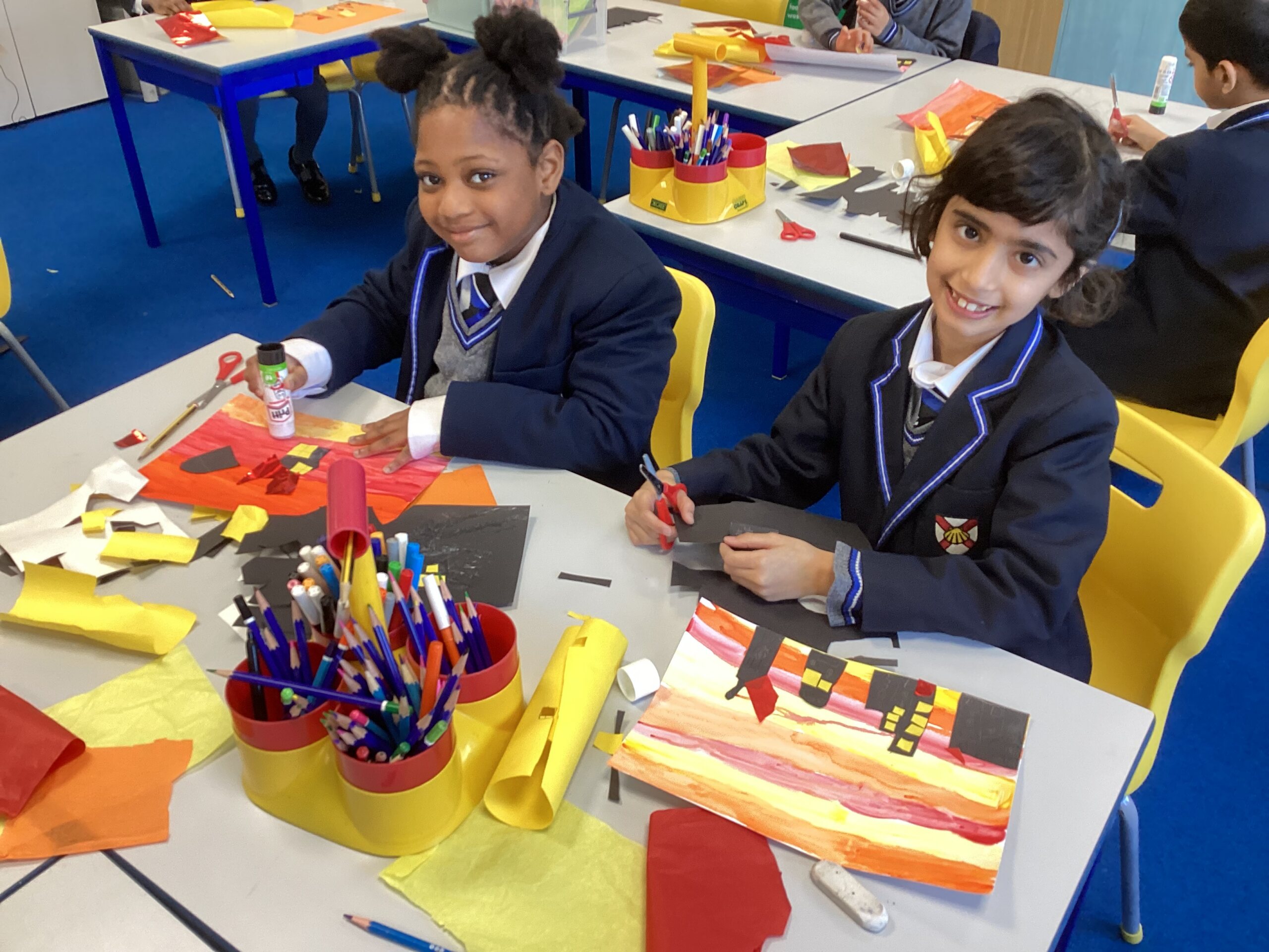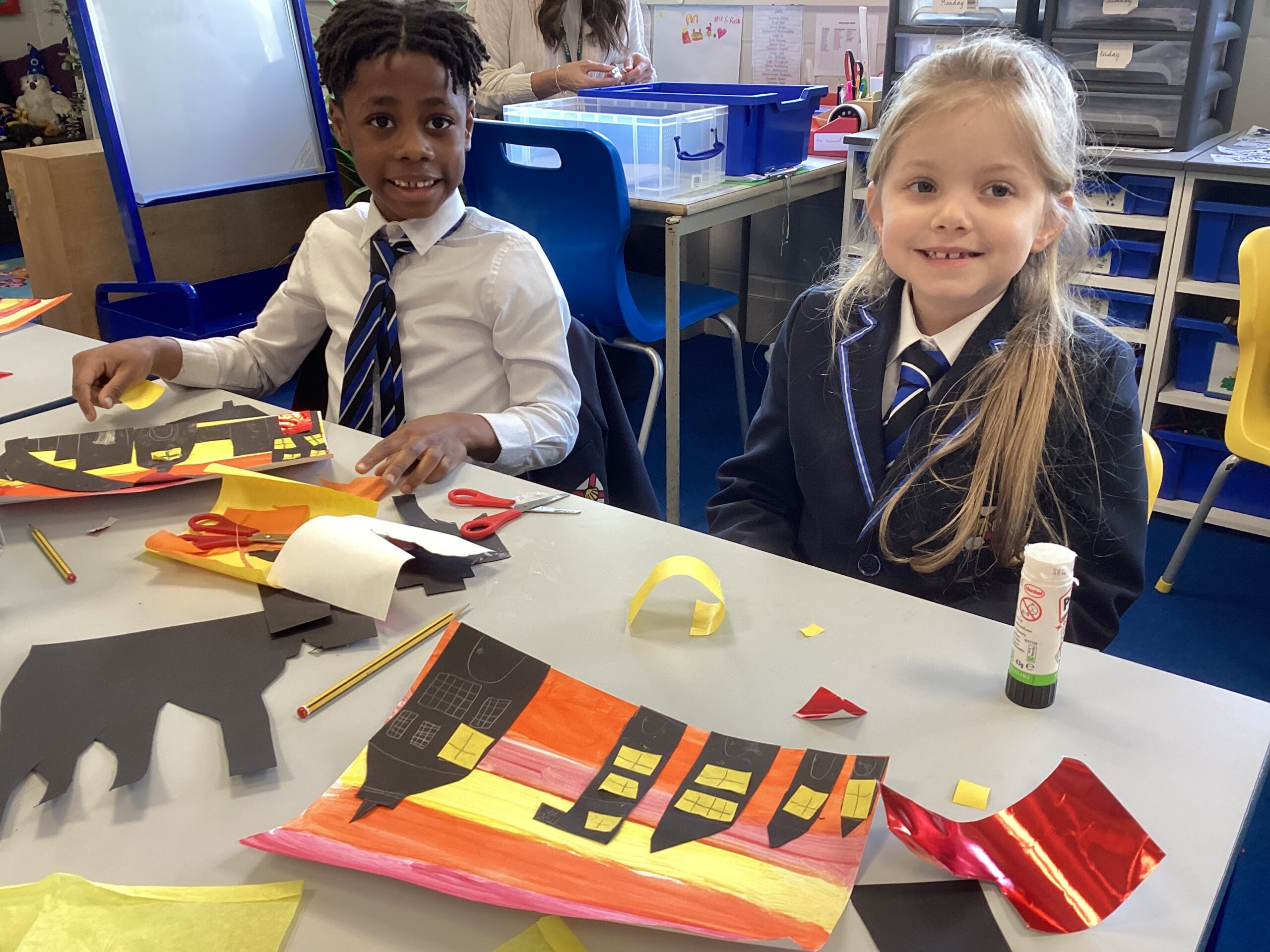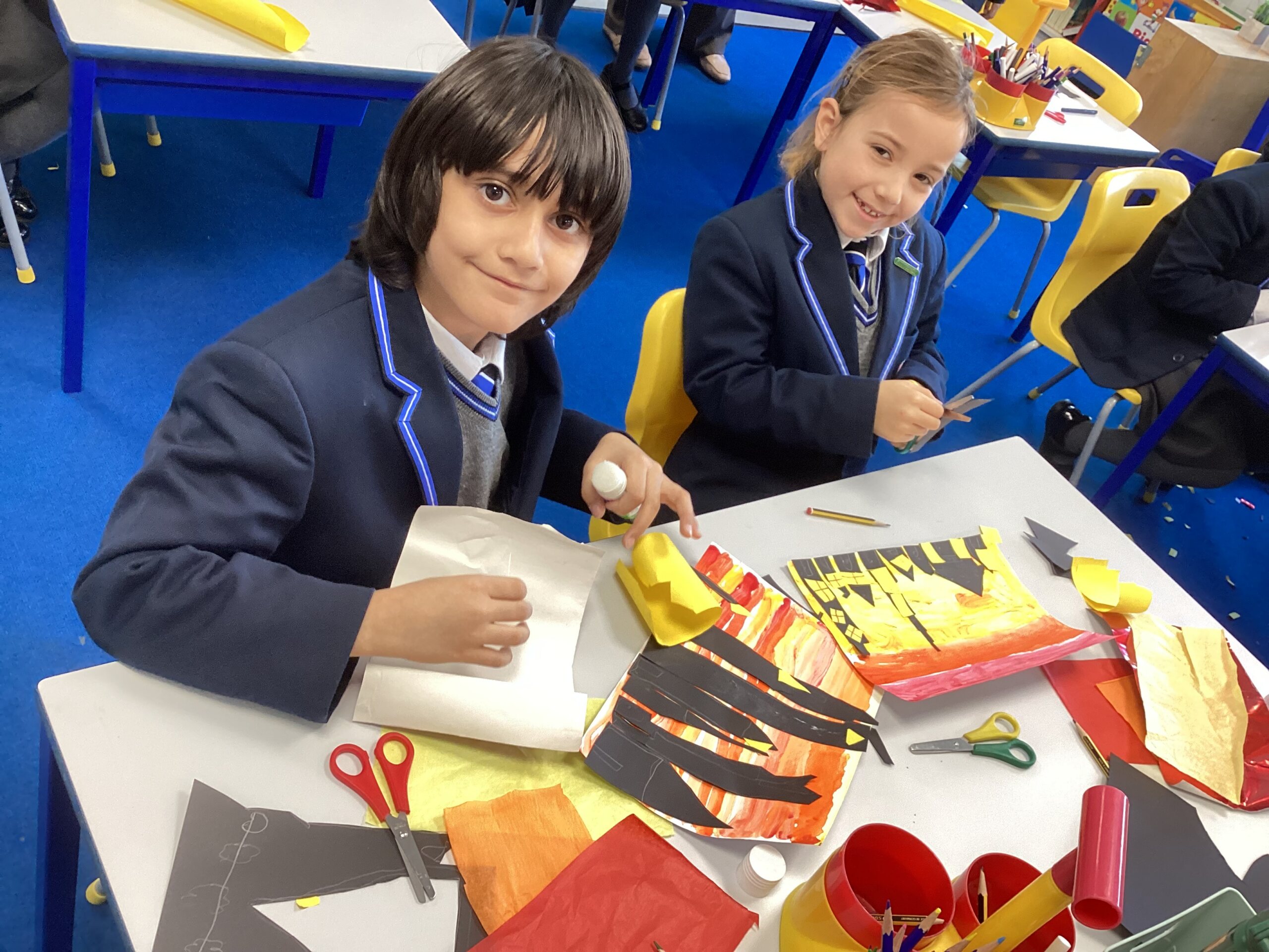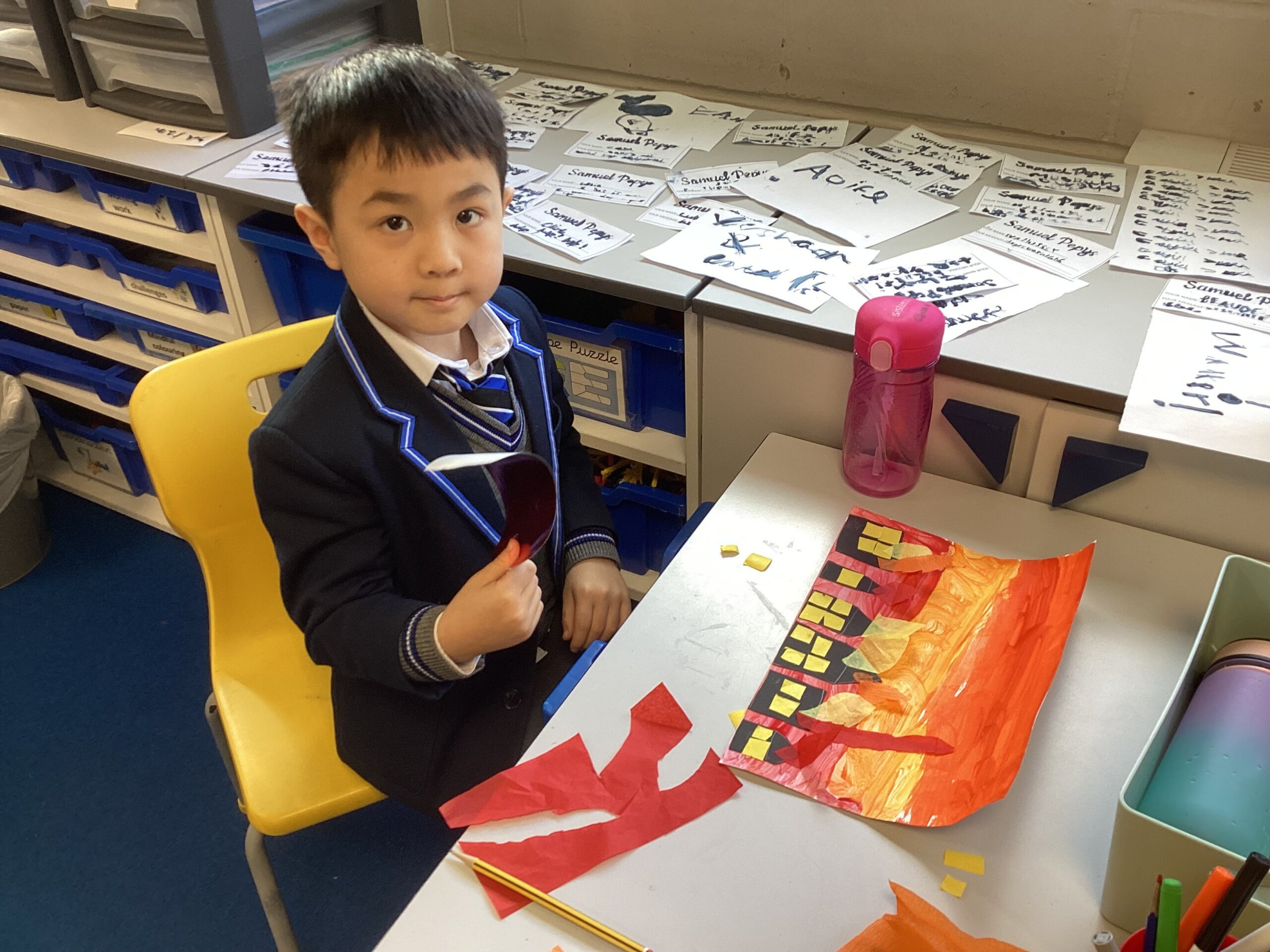 In the afternoon, the children designed colourful collages of London in 1666, complete with dramatic flames spreading through the buildings.