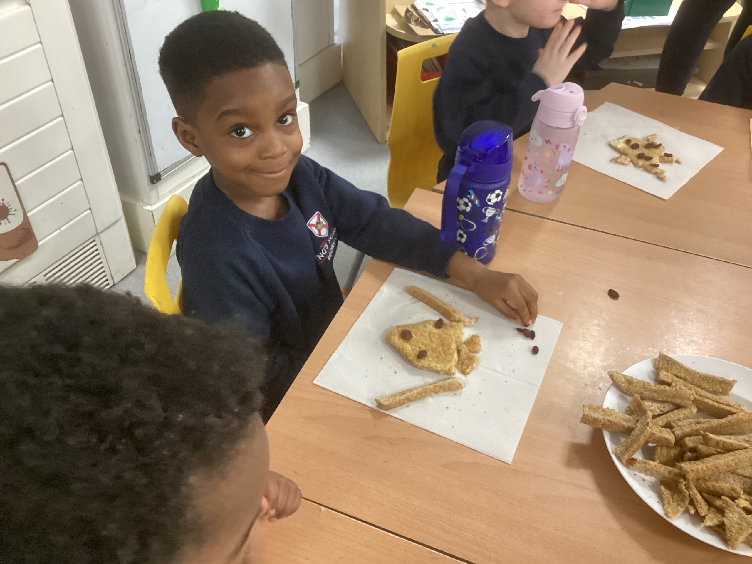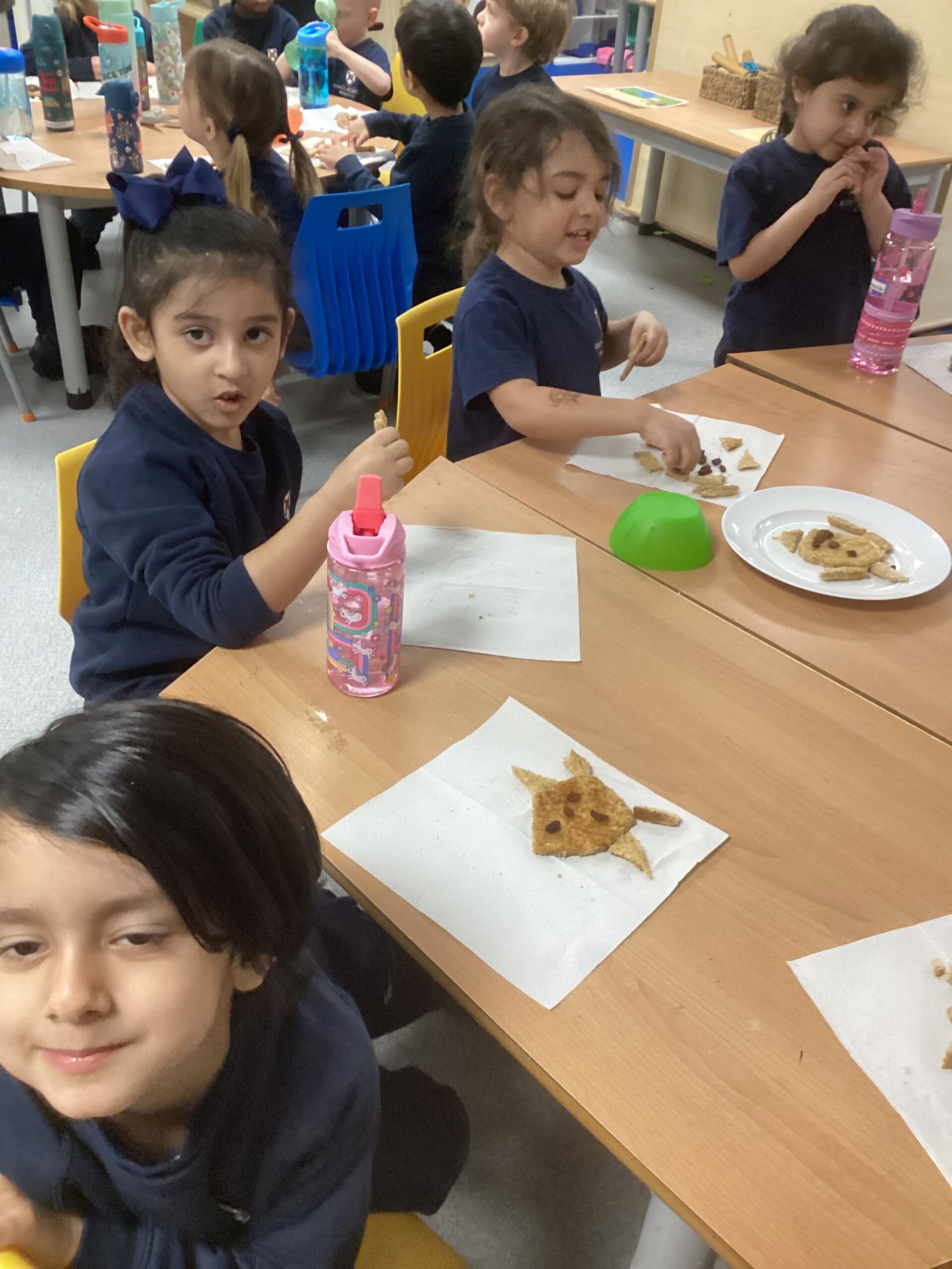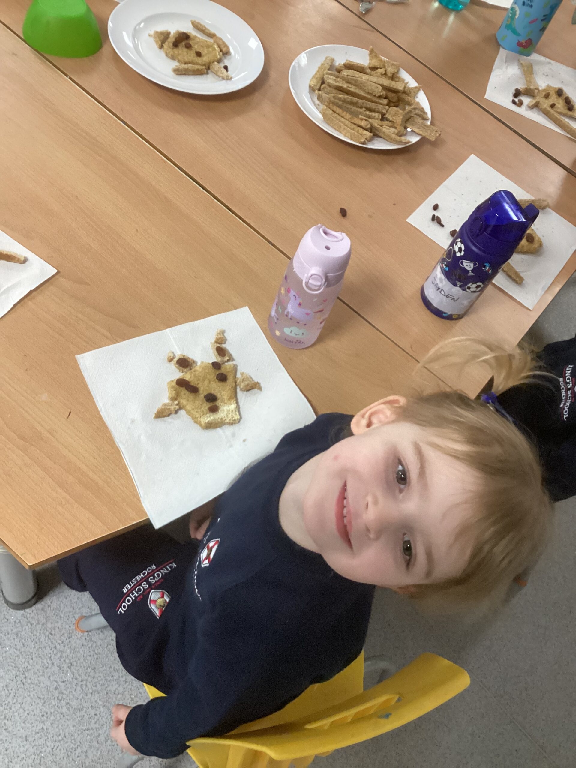 This week, as part of our exploration of traditional tales, Nursery are focusing on The Three Billy Goats Gruff. The children used bread, vegan spread and raisins to create faces, using crusts and raisins for the eyes, ears, horns and beard.